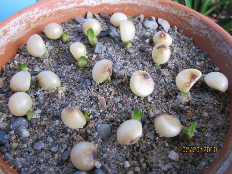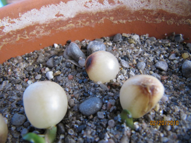 种子2009年8月授粉,2009年12月6日剪掉,果子连同半根箭放在一边没人理会,后来见一网友(没记住名字)4个月种子 育种成功,于是在2010年1月17日找到这些果子,剥开果皮后种子小但很硬,共计19粒,在水中浸泡了一天,18日下种。